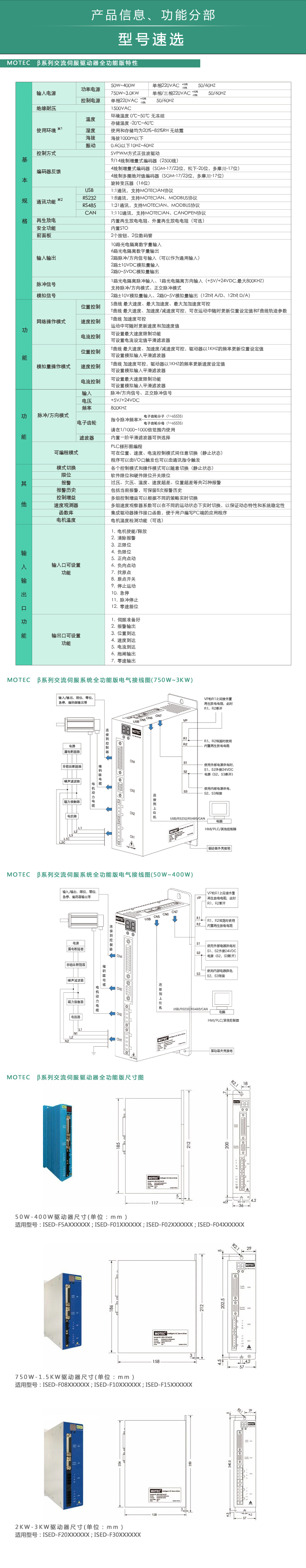 | 型号 | 功率 | 通讯方式 | 反馈 | 环境温度 | 存储温度 | PLC功能 |