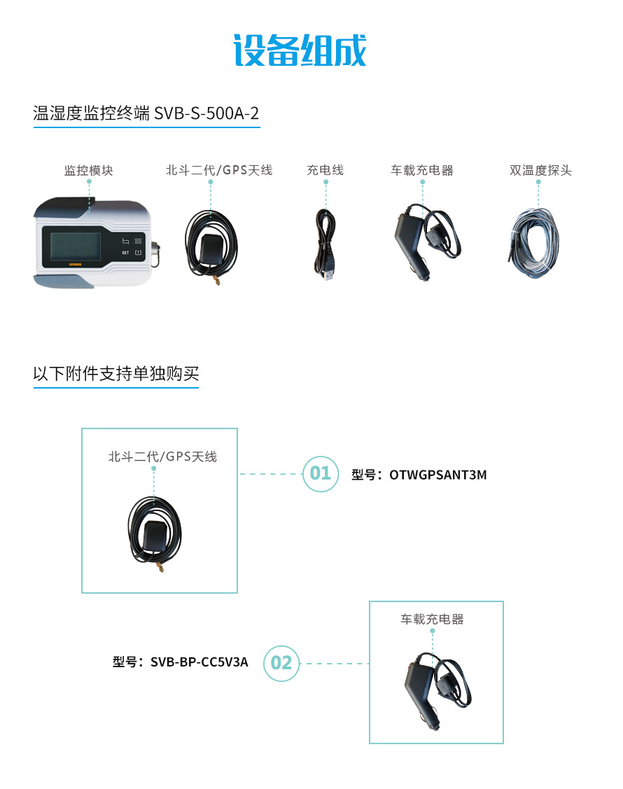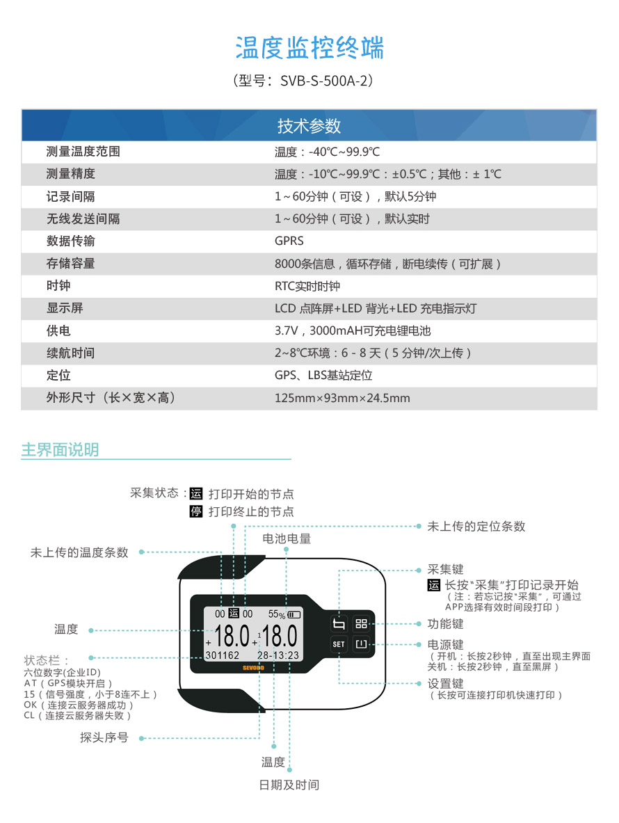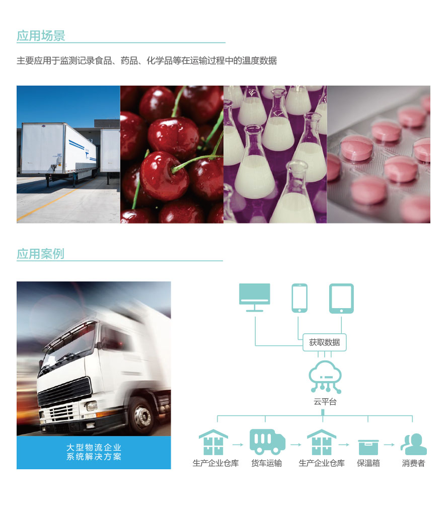 车、冰箱/冰柜、库、箱系列温(湿)度监测终端,其中终端设备包含温(湿)度惯导位置传感器、电池、GPRS/4G及显示传输设备,用于采集检测对象的温(湿)度并实时传输至冷链监管云平台。