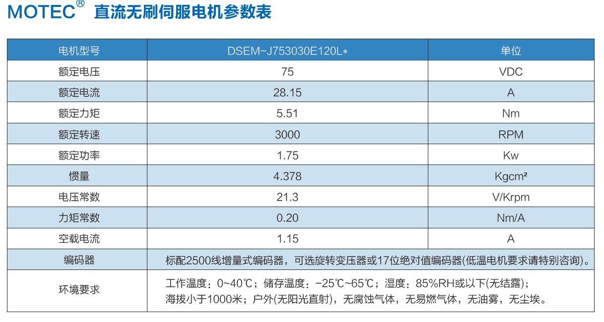 | DSEM-J753030E120LR | 75VDC | 5.51Nm | 1.75KW | 3000rpm | 28.15A | 增量式 | 是 | 0~40℃ |
