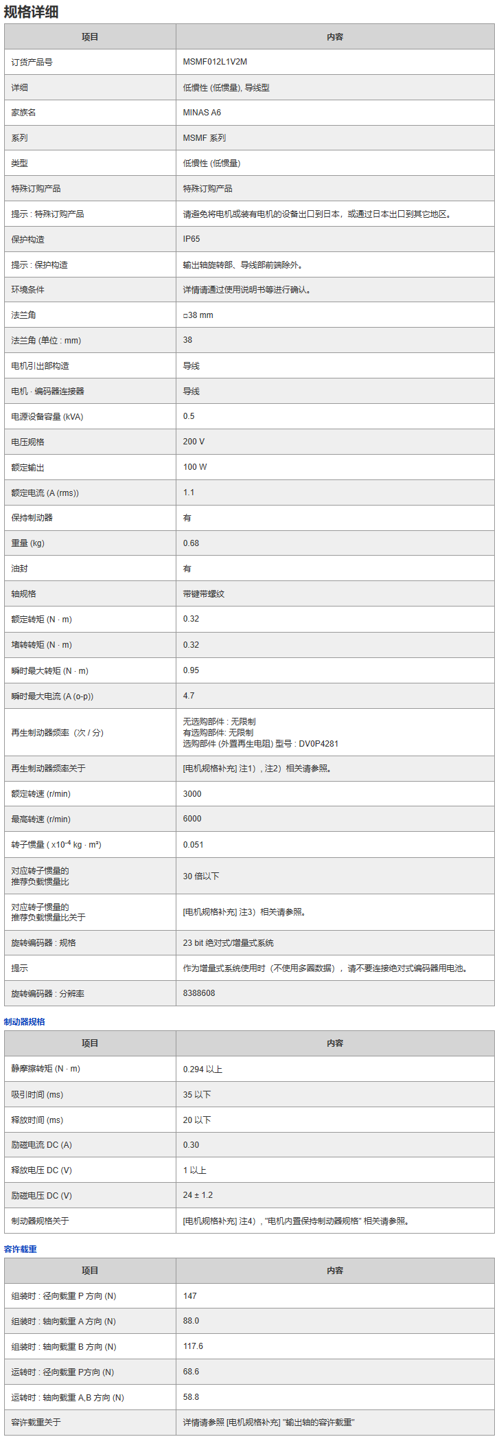 【Panasonic松下】100w伺服电机 MSMF012L1V2M
