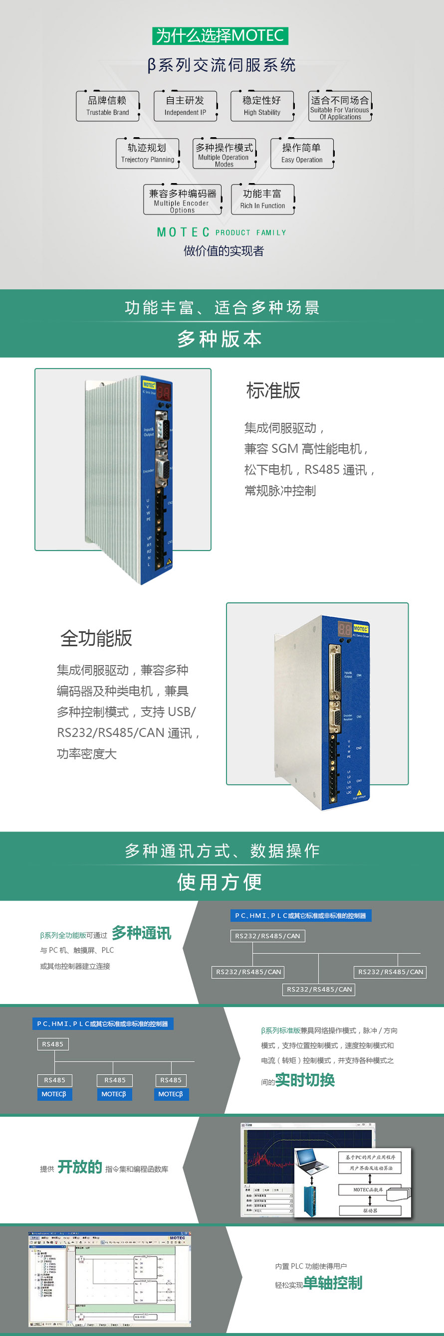 | 型号 | 功率 | 通讯方式 | 反馈 | 环境温度 | 存储温度 | PLC功能 |