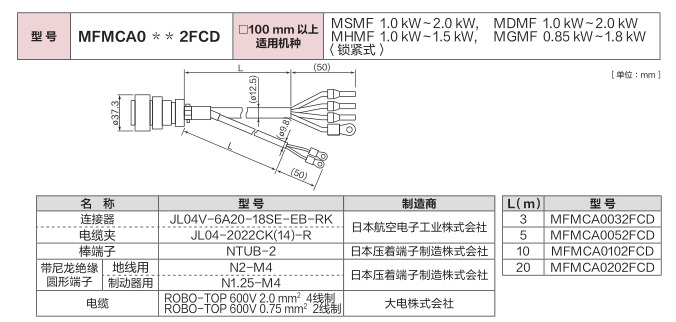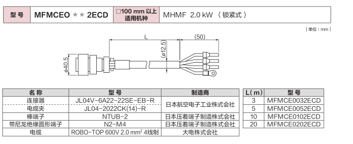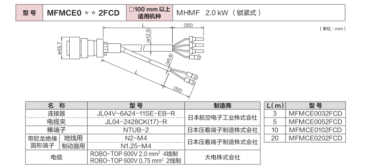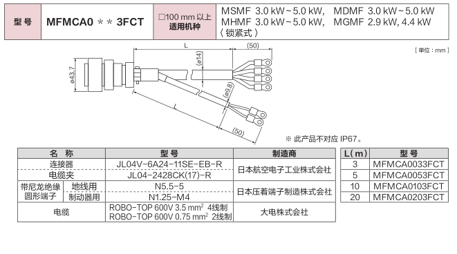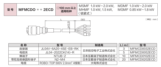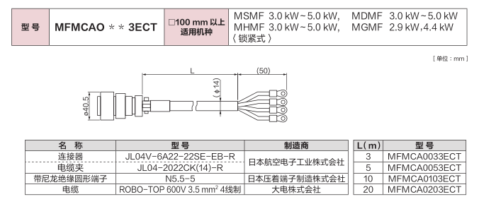 松下A6带抱闸动力线电缆,适用于100mm法兰以上电机,长度5米