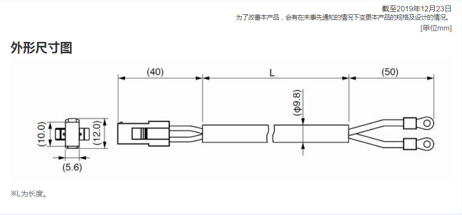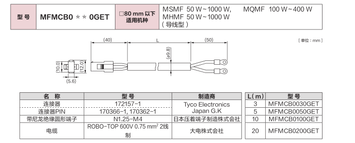 松下A6系列抱闸线缆,适用于80mm法兰以内电机,长度5米