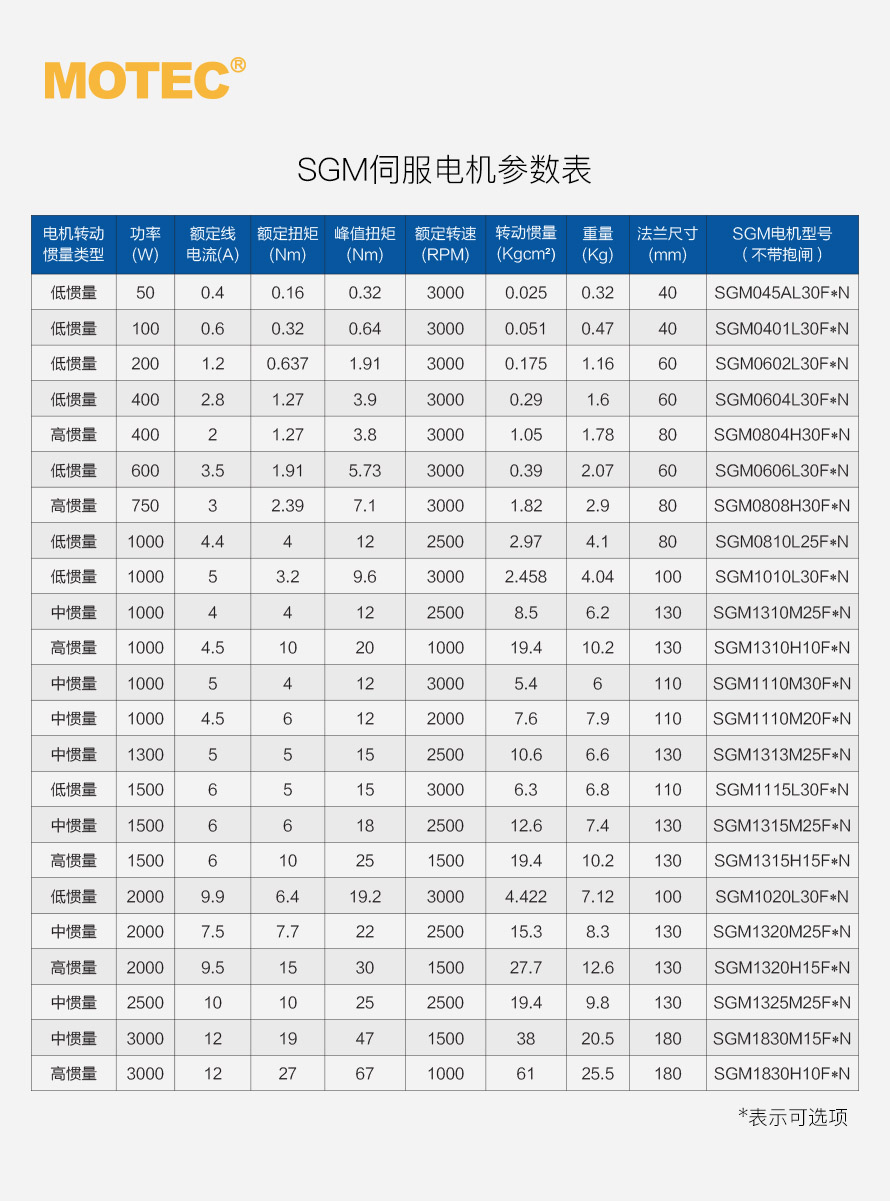 | 产品型号 | 供电电压 | 功率 | 额定转速 | 额定扭矩 | 反馈方式 | 抱闸支持 |